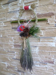 写真2012年のタイプBに取り付けてある烏瓜(カラスウリ)は、 入手困難のため、厄除けの御幣飾りへ変更となりました。 またツル飾りにも若干のサイズの変更がありますのでご了承ください。 写真はサンプルです。飾り(色や種類)の仕様は1つ1つ異なります。 |