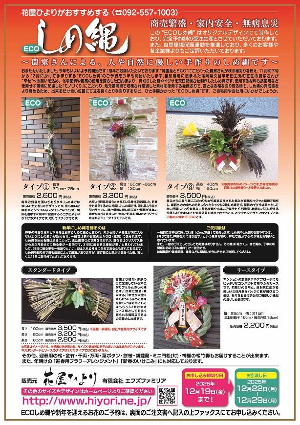 | ●2025.10.20 new!〜 秋の胡蝶蘭フェア 〜開始 topページup ●2025.10.20 new!〜 しめ縄・しめ飾り のご予約開始 topページup ●2024.05.08 〜 フラワースタンド 夏!のフェア 〜開始 topページup ●2024.03.01 〜 フラワースタンド 春のフェア 〜開始 topページup ●2023.10.23 〜 しめ縄・しめ飾り のご予約開始 〜 topページup |