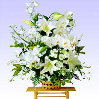凛とした美しく、白いユリのカサブランカで製作したお供え用ヨーロアンスタイルのアレンジメントです。 ■10.000円(税別) アレンジメント/ワンサイド 高さ84×幅70×奥行45cm |