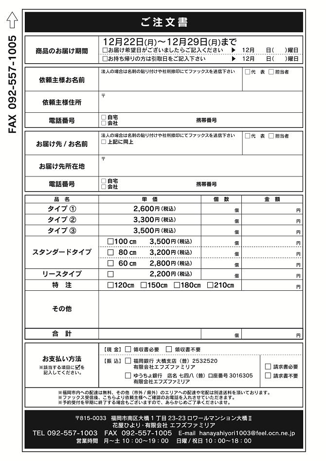 電話でのご注文・お問い合わせ tel 092−557−1003 ※お車でのご来店のお客さまへ お車でお越しのお客さまは当店近隣のコインパーキングをご利用くださいませ。 当社にて3,000円(税別)以上の商品をご購入やご予約のお客さまに限り、 駐車場代(40分100円)をご負担させていただきます。清算の際にスタッフまでお申し付けください。 |